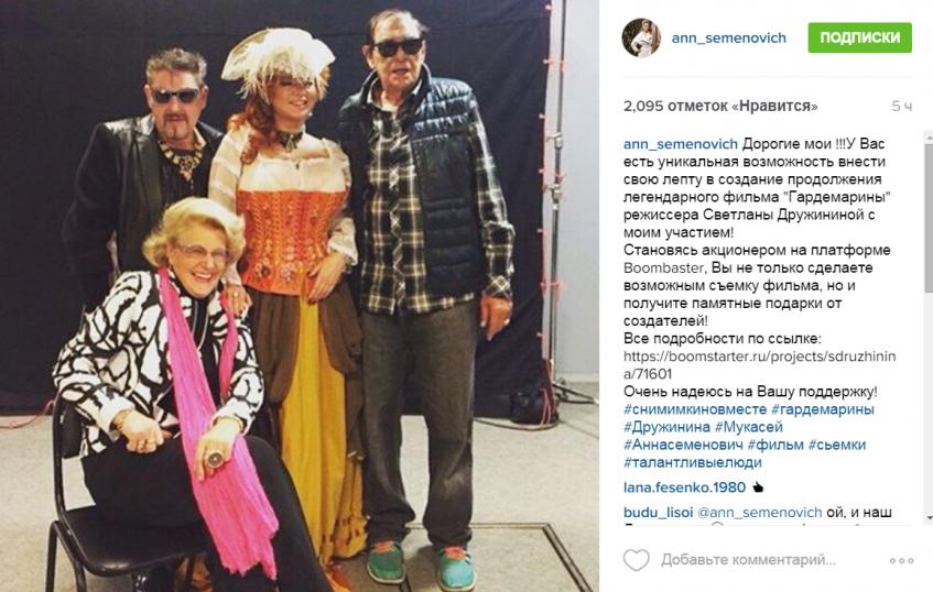 Анна опубликовала в своем Instagram замечательное фото, в подписи к которой предложила всем поклонникам стать частью съемочного процесса. «Дорогие мои!!! У Вас есть уникальная возможность внести свою лепту в создание продолжения легендарного фильма «Гардемарины» режиссера Светланы Дружининой с моим участием! Становясь акционером на платформе Boombaster, Вы не только сделаете возможным съемку фильма, но и получите памятные подарки от создателей!»