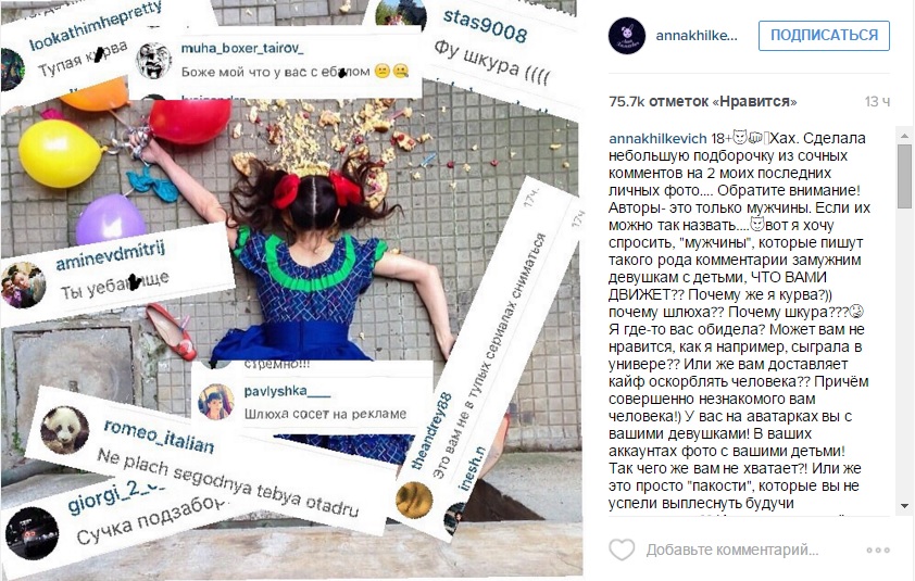 Анна решила не молчать. Она сделала коллаж, на котором собрала несколько оскорблений, и высказалась: «Сделала небольшую подборочку из сочных комментов на 2 моих последних личных фото. Обратите внимание! Авторы это только мужчины. Если их можно так назвать… Вот я хочу спросить, "мужчины", которые пишут такого рода комментарии замужним девушкам с детьми, ЧТО ВАМИ ДВИЖЕТ?Я где-то вас обидела? Может, вам не нравится, как я, например, сыграла в "Универе"? Или же вам доставляет кайф оскорблять человека? Причём, совершенно незнакомого вам человека!) У вас на аватарках вы с вашими девушками! В ваших аккаунтах фото с вашими детьми! Так чего же вам не хватает?! Или же это просто "пакости", которые вы не успели выплеснуть будучи подростками?? И после этого ещё кто-то будет говорить, что "бабы злые"! Ну-ну;) И ещё вот эти "обозлённые и невоспитанные мужички" появились за последний месяц… Неужели рождение ребёнка так на вас повлияло? Или может вы позавидовали фигуре моего мужа? Или же это "не твоя — вот ты и бесишься!"??? Я, честно, теперь буду блокировать каждого такого псевдо-мужчину. Жаль, что это максимум, что можно тут сделать. И вообще, что такое "шкура" на вашем сленге? Хочется узнать все о себе! О, как приятно, порой, быть публичным человеком. Обожаю!»