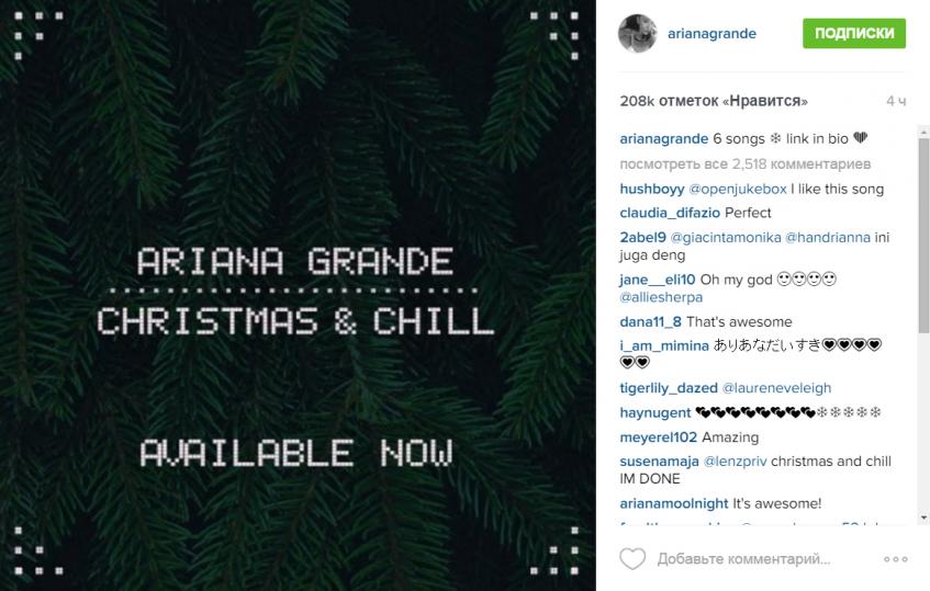 Для поклонников Арианы Гранде (22) Рождество наступило раньше срока. 17 декабря певица решила порадовать фанатов замечательным новогодним подарком: звезда представила новый мини-альбом «Christmas & Chill».