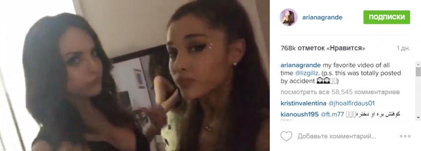 Например, 5 октября Ариана и Элизабет явно находились в прекрасном настроении и хотели совершить что-нибудь безумное. И им это удалось. Ариана выложила в Instagram короткое видео, где девушки целуют друг друга в губы. «Мое любимое видео с Элизабет Гиллис. (P.S. оно опубликовано совершенно случайно)», — написала Арианна.