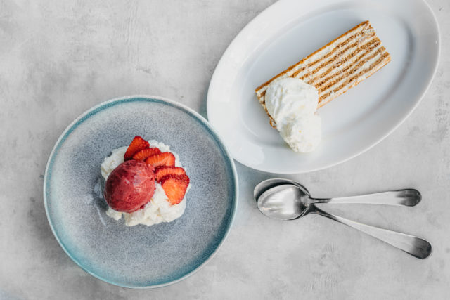 В десертах тоже новинки: медовик со сливочно-сметанным муссом (450 руб.) и «Павлова» с ягодами и малиновым сорбетом (590 руб.).