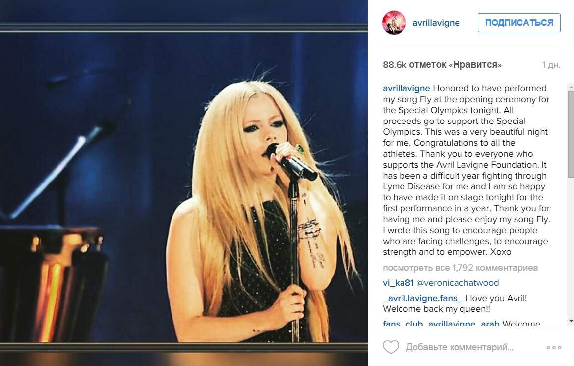 На церемонии певица выступила с новой песней «Fly», после чего опубликовала в Instagram трогательную запись: «Для меня огромная честь представлять свою новую песню Fly на церемонии открытия Всемирных Специальных Олимпийских игр этим вечером. Все доходы пойдут на поддержку этих игр. Это был потрясающий вечер для меня. Поздравляю всех спортсменов! И спасибо всем, кто поддерживает мой фонд Avril Lavigne Foundation! Это был тяжелый год борьбы с болезнью Лайма, и я очень рада, что смогла сегодня выступить. Благодарю за вашу поддержку и желаю приятного прослушивания моей новой песни! Я написала ее для того, чтобы поддержать людей, столкнувшихся с огромными препятствиями и испытаниями».