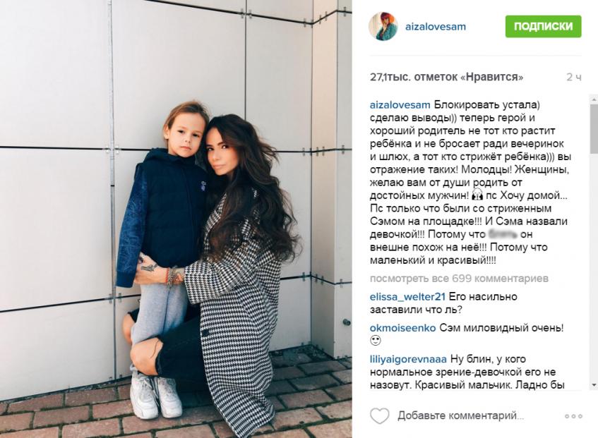 Тогда Айза решила удалить злосчастный снимок, но при этом опубликовала еще одно фото, под которым обратилась ко всем недоброжелателям. «Блокировать устала) сделаю выводы)) теперь герой и хороший родитель не тот, кто растит ребенка и не бросает ради вечеринок и шлюх, а тот, кто стрижет ребенка», — написала девушка.
