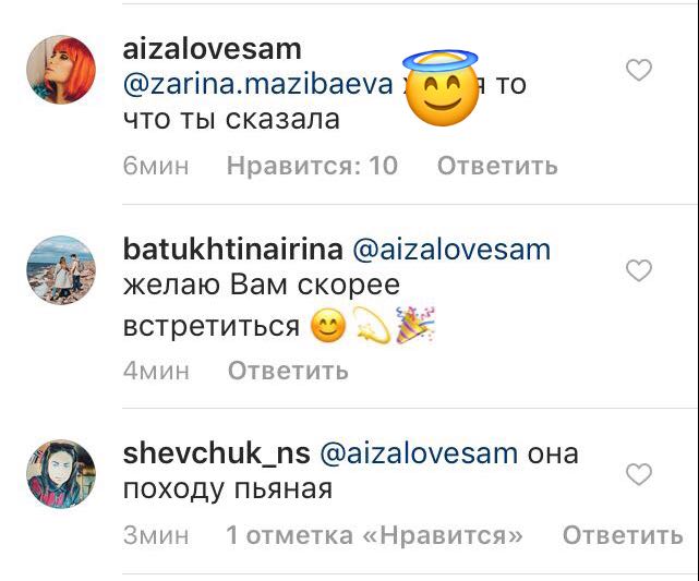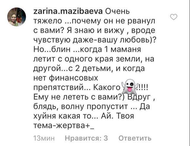 Но…блин…когда 1 маманя летит с одного края земли, на другой…с 2 детьми, и когда нет финансовых препятсвий….Какого х*я!!!». Такого напора Анохина не выдержала и вступила в перепалку. Остальные фолловеры тут же встали на сторону Айзы, а несчастной, которая решила написать такой комментарий, не поздоровилось: кто-то даже решил, что она просто была пьяна.