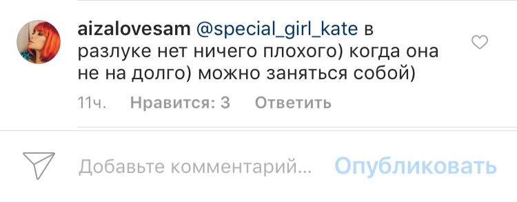 В своем Instagram Айза отметила, что в их с мужем разлуке нет ничего страшного: «В разлуке ничего плохого нет, когда она ненадолго. Можно и собой заняться», -написала она.