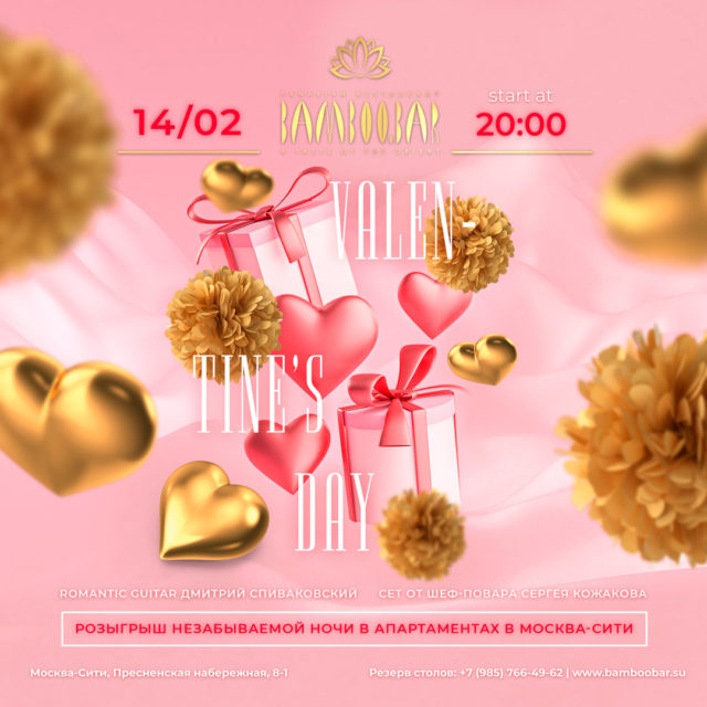 В День всех влюбленных гостей ждет пунш с замороженной розой и специальное предложение – 20% скидки, которую можно получить, сфотографировав пунш и выложив в социальные сети. Угощать в BAMBOO.BAR в этот день будут сеты для пар, а в одном из них будет спрятан сюрприз – романтический уикенд в лучших апартаментах «Москва Сити».
