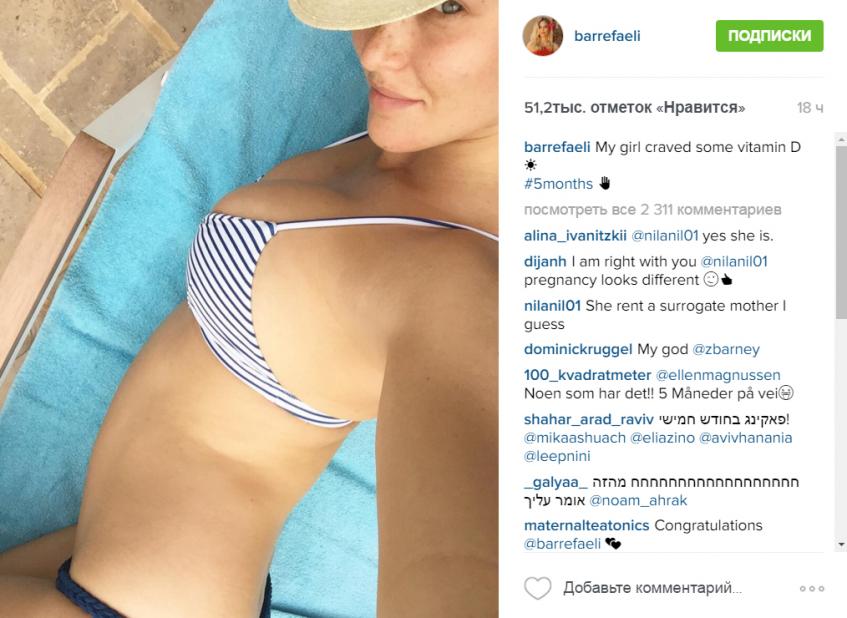 Так, 25 марта Бар опубликовала на своей странице в Instagram новое фото, на котором она неожиданно для поклонников предстала в купальнике. При этом модель решила похвалиться не шикарной фигурой а тем, как подрос ее животик. Специально для этого Бар легла на бок.