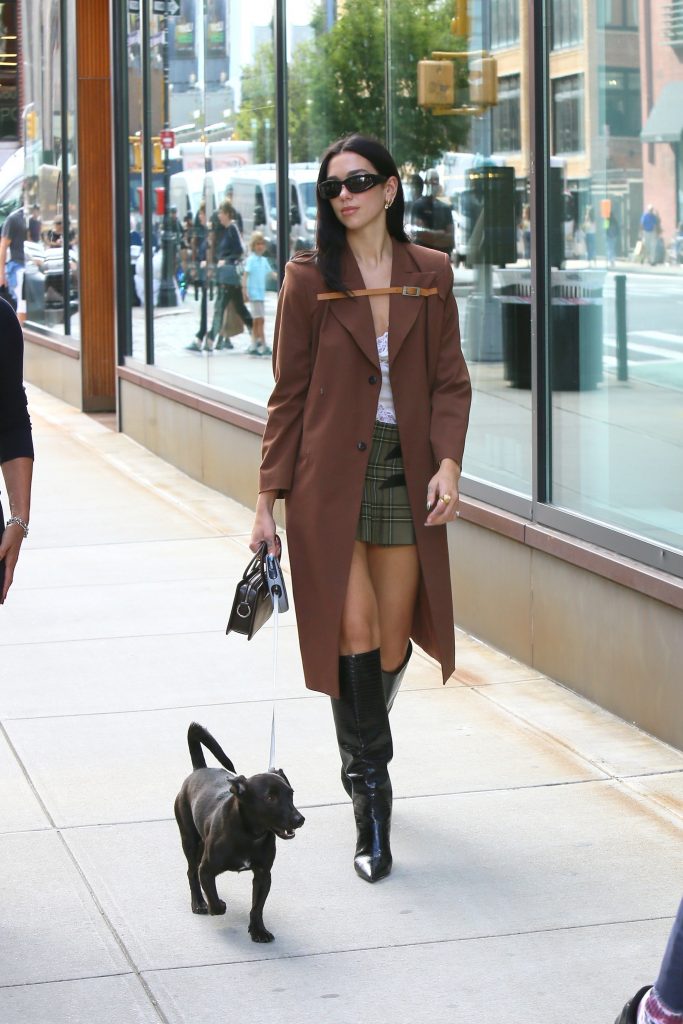 Следом за подругой мини-юбку примерила и Дуа Липа. Певица стилизует ее с пальто в коричневом оттенке, мини-сумкой и ботфортами.