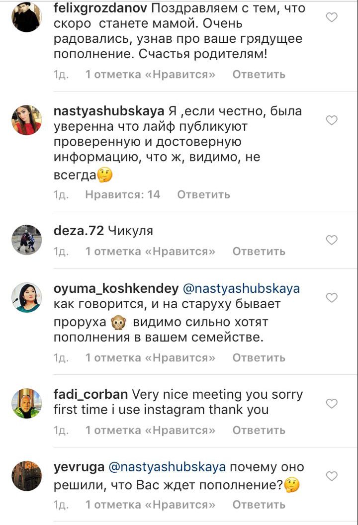 Кажется, что заявление можно считать опровержением? Некоторые поклонники, не обращая внимания на комментарий Насти, продолжали поздравлять ее с пополнением. Другие, наоборот, поддерживали девушку.