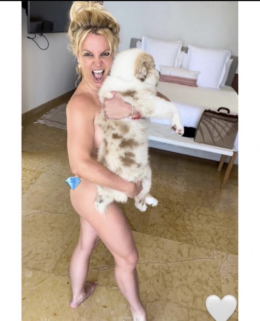 Так, например, накануне звезда опубликовала смелый снимок, на котором она позирует абсолютно голой вместе со своей собакой Сойером. Четвероногий друг певицы прикрывал ее подрастающий живот, а эмодзи бриллианта скрывало самые пикантные места.