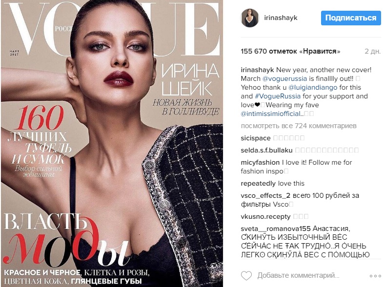 Несмотря на «интересное положение» Ирина Шейк (31) продолжает вести активный образ жизни. Модель снялась для обложки мартовского номера российского Vogue. Снимок из новой фотосессии она опубликовала в Instagram.