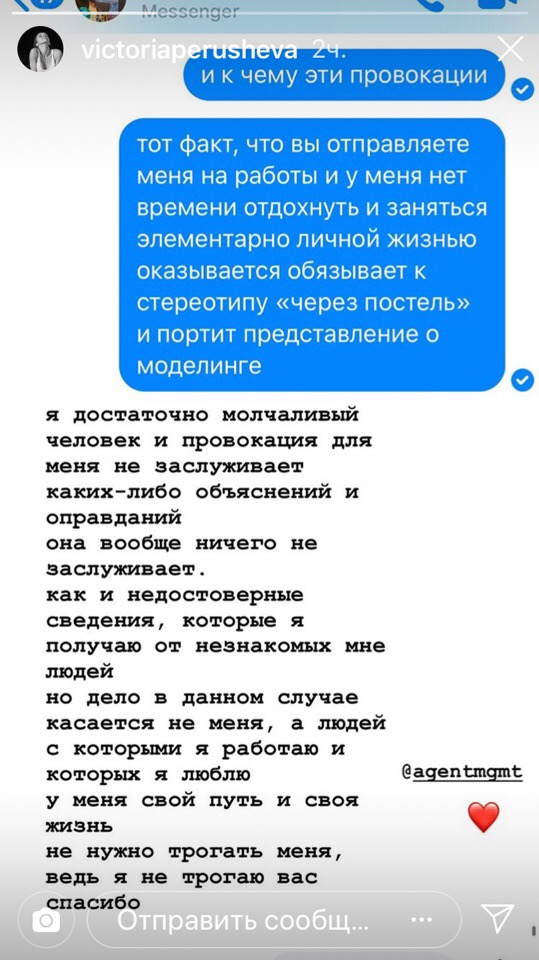 Вика молчать, кстати, не стала! Она выложила в Stories скриншот переписки с менеджером и текстом: «Я достаточно молчаливый человек и провокация для меня не заслуживает каких-либо объяснений и оправданий. Она вообще ничего не заслуживает. Как и недостоверные сведения, которые я получаю от незнакомых мне людей. Но дело в данном случае касается не меня, а людей, с которыми я работаю и которых я люблю. У меня свой путь и своя жизнь. Не нужно трогать меня, ведь я не трогаю вас. Спасибо». Берем попкорн!