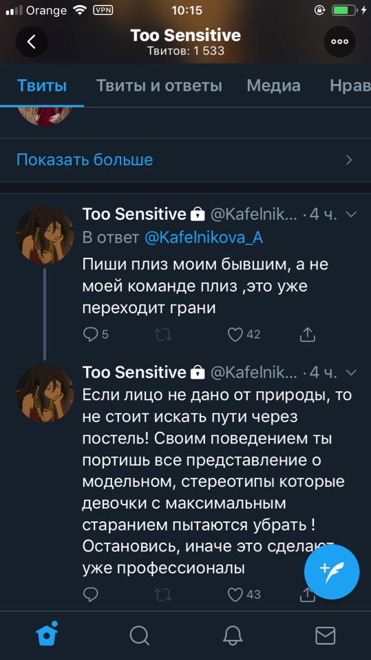 Позже Кафельникова опубликовала два новых твита: «Если лицо не дано от природы, то не стоит искать пути через постель! Своим поведением ты портишь все представление о модельном, стереотипы, которые девочки с максимальным старанием пытаются убрать! Остановись, иначе это сделают уже профессионалы. Пиши плиз моим бывшим, а не моей команде, это уже переходит грани» (здесь и далее: орфография и пунктуация авторов сохранены — прим. ред.).