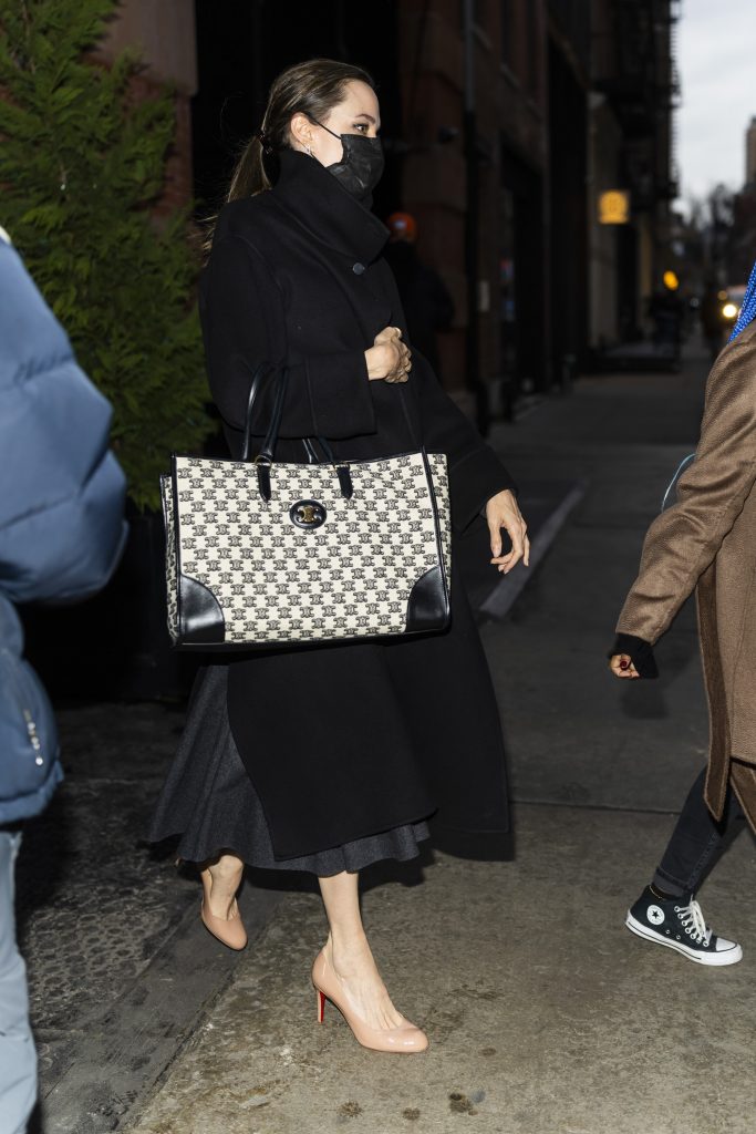 Накануне Анджелину заметили в аэропорту Нью-Йорка вместе с ее дочкой Захарой. Вместе с классическим пальто актриса надела бежевые лодочки Christian Louboutin и дополнила объёмной сумкой.