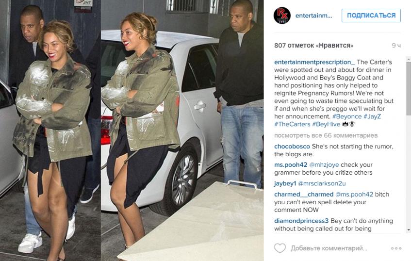 Именно такой вывод сделали фанаты, увидев новые фото пары, сделанные вечером 10 января у одного из ресторанов Голливуда. На снимках Бейонсе появилась в черном платье, поверх которого она накинула свободную военную куртку, которая, по мнению фанатов, прикрывает округлившийся животик артистки. Однако некоторые из них предположили, что певица, которая в последнее время перестала соблюдать диету, просто поправилась.
