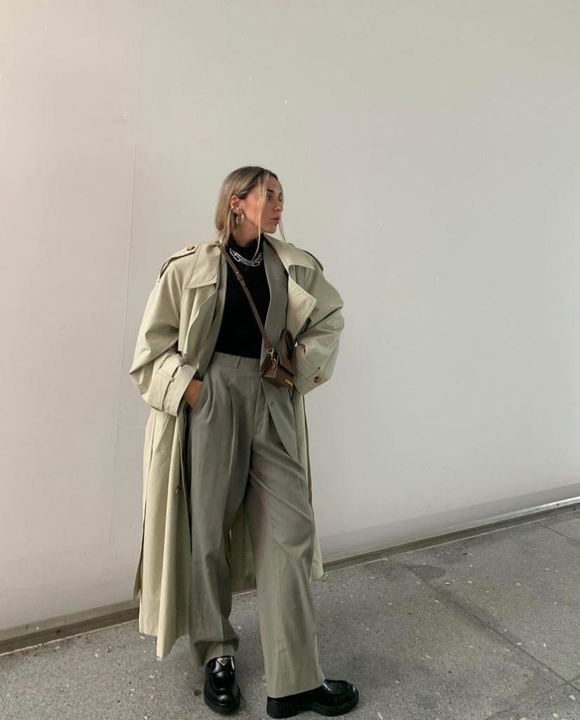 Чтобы составить стильный аутфит с тренчем, достаточно просто дополнить его безразмерным кожаным тоутом, высокими сапогами или грубыми ботинками.