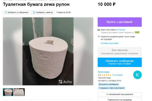 «Парад безумия» завершает продажа средств личной гигиены. Так, кто-то продает рулон туалетной бумаги Zewa за 10 000 рублей.