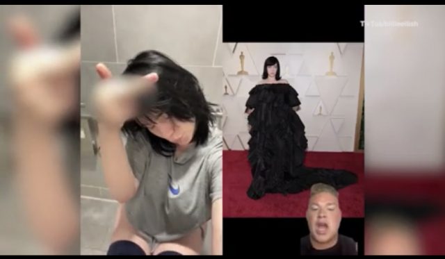 Она записала TikTok в дуэте с парнем, который сделал обзор на ее платье, как на худшее за церемонию в этом году. Билли была немногословна. Она просто сидя, простите, в туалете, показала недоброжелателям средний палец. Очень в стиле Билли!