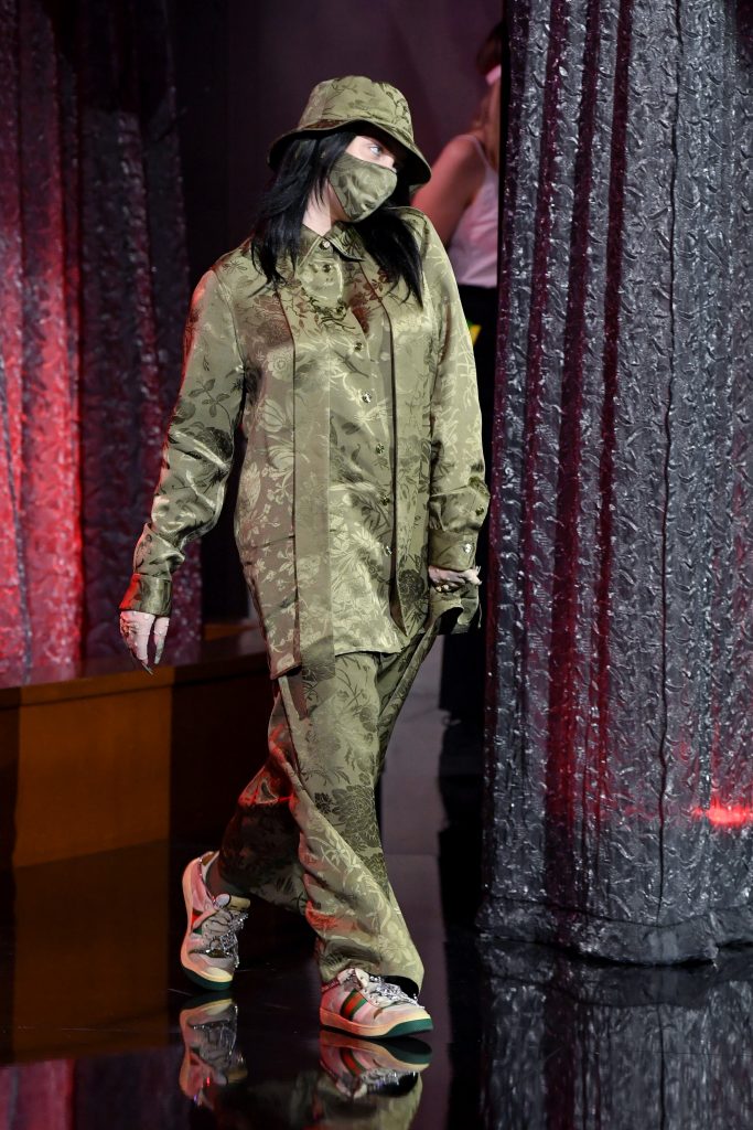 На красной дорожке Билли продемонстрировала костюм из объемной блузы и брюк из шелковой парчи от Gucci, в котором точно так же появлялась на церемонии Billboard Awards в 2020 году. И перед нами, кстати, весьма достойное заявление для селебрити первого эшелона. К примеру, те же представительницы четы Кардашьян-Дженнер никогда не надевают один образ дважды – у звездных сестер есть даже сайт Kardashian Kloset, где они распродают свои вещи, например, сумки Hermes, увидевшие свет фотокамер лишь раз.