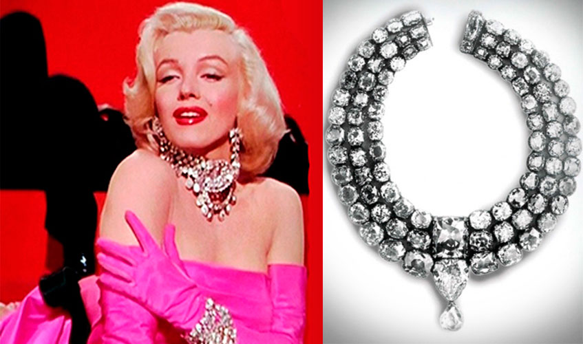 Одной из самых знаменитых драгоценностей в мире кино можно считать колье Мэрилин Монро из фильма «Джентльмены предпочитают блондинок». Мэрилин была в нем обворожительна. Главной частью колье стал известный индийский бриллиант Moon of Baroda, снятый с совершенно другого украшения, принадлежавшего королевской семье. К сожалению, после фильма след великолепного колье затерялся, а немного позже бриллиант всплыл на одном из аукционов уже отдельно, за него давали $1 000 000. Остальные части украшения так и не нашлись.