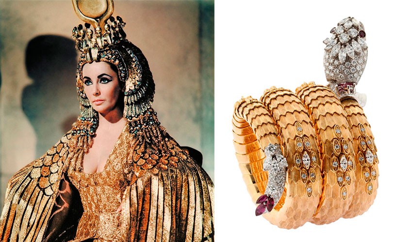 В фильме «Клеопатра» украшения Bvlgari оттеняли жгучие средиземноморские формы Элизабет Тейлор. С тех самых пор актриса стала верной поклонницей этого ювелирного дома. Помимо рекордного по тем временам гонорара в $1 млн Элизабет прихватила со съемок кольцо Bvlgari с бриллиантом и часы-браслет в виде змеи. Часы стали самым дорогим сувениром, который Элизабет унесла со съемочной площадки.