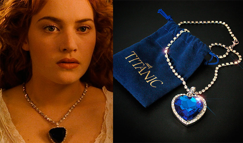 По сюжету картины «Титаник» сапфир в форме сердца, украшающий знаменитое колье «Сердце океана», ранее был частью короны Людовика XVI. В реальности все не так романтично. Изделие создано ювелирным домом Asprey & Garrad, выполнено из белого золота и инкрустировано фианитами. Его стоимость составляет всего лишь $10 тысяч, что является довольно скромной суммой для такого проекта, как «Титаник». Но, вдохновившись успехом фильма, ювелиры из Asprey & Garrad создали точную копию ожерелья, украсив его сапфиром в 170 карат и 65 бриллиантами по 30 карат каждый. Драгоценность была продана на благотворительном аукционе за $2 200 000.