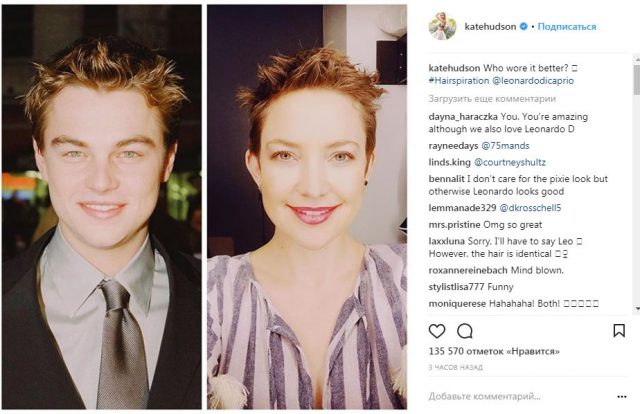И вот, сейчас волосы Кейт немного отросли, и она может экспериментировать с прическами. Так, звезда повторила образ Леонардо ДиКаприо (43) из 90-х, сделала коллаж и предложила подписчикам в Instagram выбрать, кому больше идет.