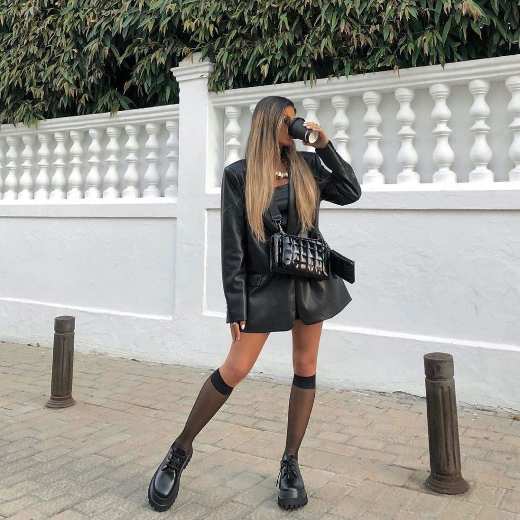 Пожалуй, любимый тренд всех модных блогеров. Носи грубые ботинки с чёрными капроновыми гольфами. Совет: сочетай их с бермудами, мини-юбками и платьями.