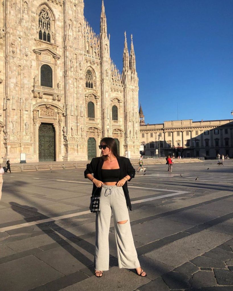 Сочетай спортивки с вещами из офисного гардероба. Например, с базовым топом и кожаным пиджаком. Дополни образ мюлями.
