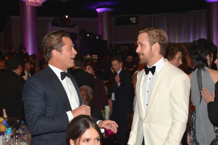 Брэд вышел на сцену в компании Райана Гослинга (35), который неожиданно выглядел старше, чем его коллега. На гладко выбритом лице Брэда не было ни единой глубокой морщинки, а прическа вновь обрела знакомые черты, напоминающие о первых ролях актера.