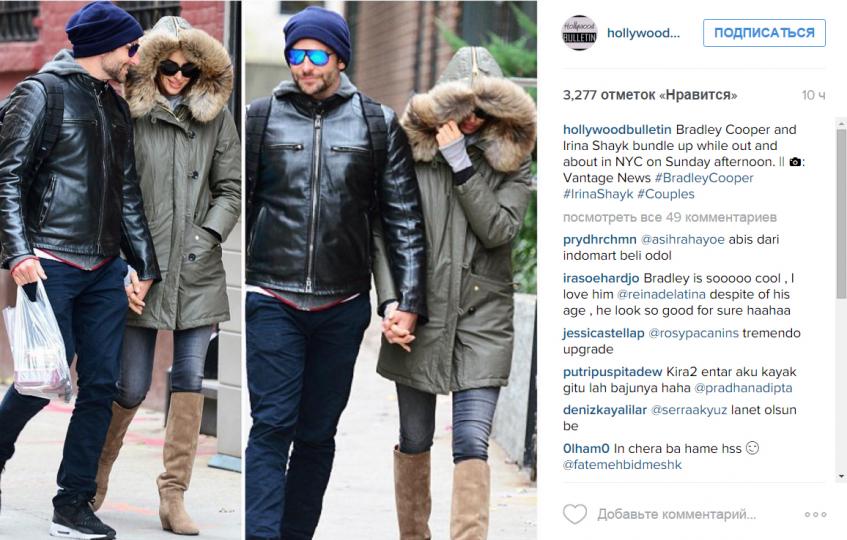 22 ноября папарацци застали Брэдли в компании Ирины, когда они решили прогуляться не так далеко от своего дома. Актер, одетый в черную кожаную куртку, темные брюки, кроссовки и синюю шапку, крепко держал за руку возлюбленную, которая появилась в оливковой парке, джинсах и высоких замшевых сапогах. Брэдли и Ирина выглядели абсолютно счастливыми и не пытались скрываться.