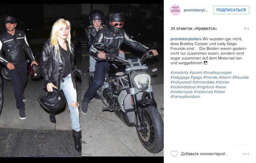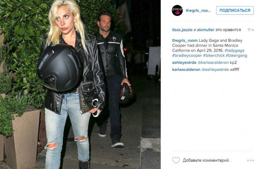 Как и положено любителям этого вида транспорта, Брэдли и Леди Гага были одеты под стать друг другу: и актер, и исполнительница хита Poker Face появились в черных кожаных куртках, держа шлемы в руках.