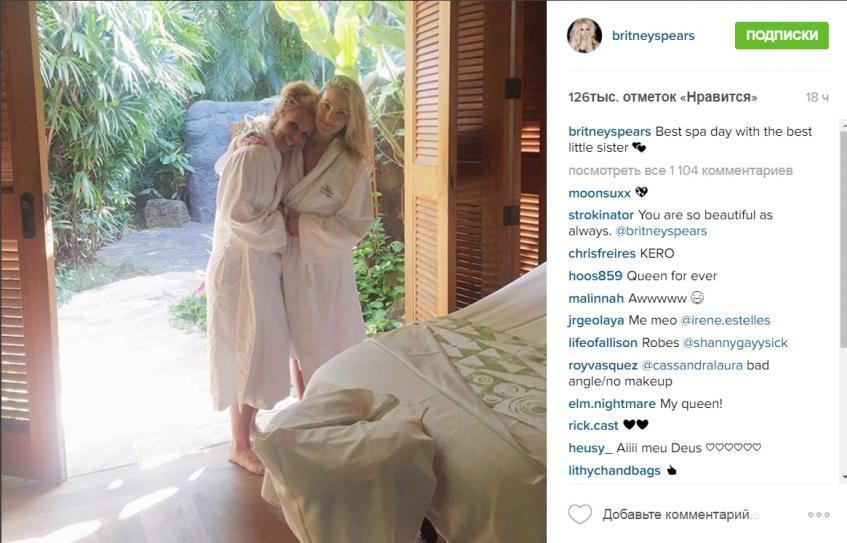Но не стоит думать, что звезда все время тратит только на спорт и выступления. Во время отдыха она старается проводить больше времени с родными. Например, в тот же день она опубликовала совместное фото с младшей сестрой Джейми Линн (24), которое было сделано после того, как красавицы вернулись из спа.