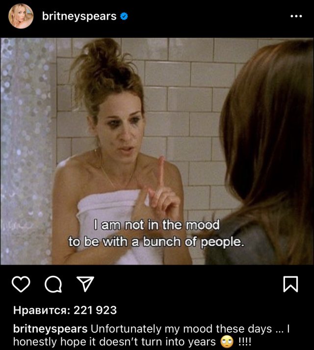 Бритни поделилась кадром из сериала «Секс в большом городе», когда Кэрри Брэдшоу сказала, что она «не в настроении быть в компании людей». «К сожалению, мое настроение в эти дни… Честно говоря, я надеюсь, что оно не превратится в годы», — призналась певица в посте.