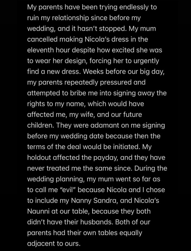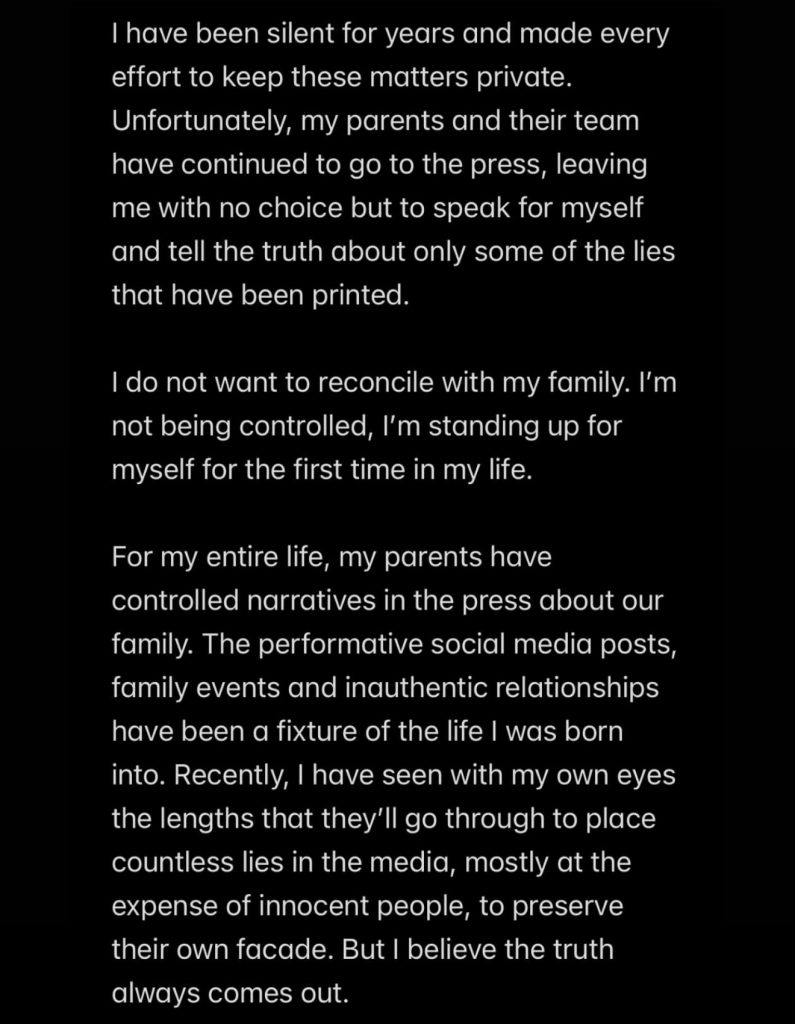 В публикации он прямо заявил, что не стремится к примирению и чувствует, что его попытки построить личную жизнь и сохранить внутреннее спокойствие не получили поддержки со стороны родителей. А напротив, он обвиняет их в тотальном контроле, попытках управлять общественным мнением.