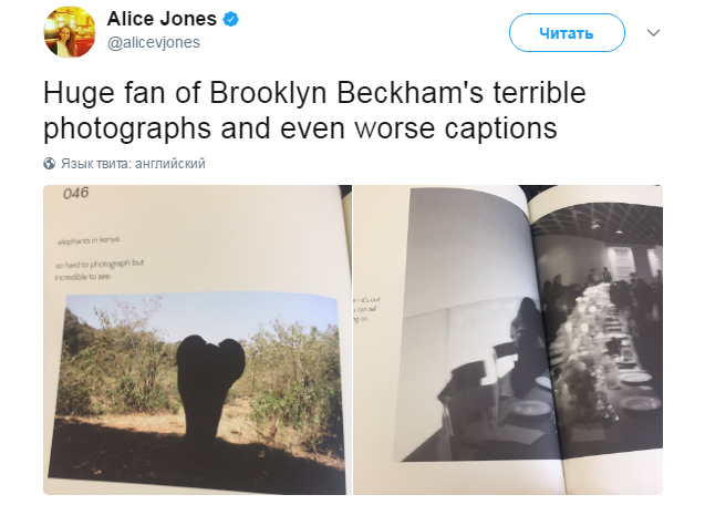 Некоторые снимки из книги уже утекли в Сеть — и, как выяснилось, не всем они нравятся. Пользователи соцсетей пишут, что снимки «ужасные, а подписи к ним — еще хуже». Снимок обеденного стола Бруклин подписал «Увы, камера не сфокусировалась, но вы можете увидеть много интересного за столом», а слона — «Так сложно сфотографировать, и так невероятно увидеть».