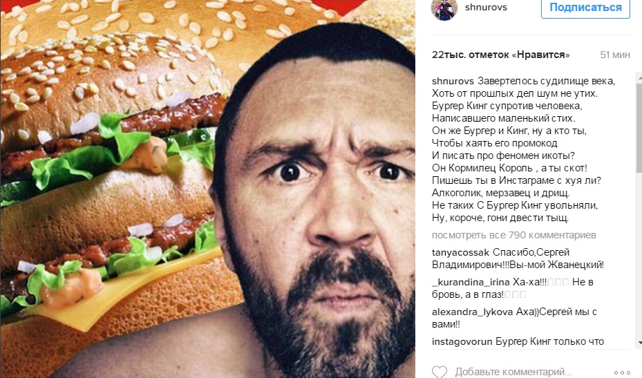 В нескольких шуточных строчках музыкант упомянул знаменитую сеть фаст-фуда «Бургер Кинг». А им это не понравилось, заявили, что подадут в суд. А как отреагировал Шнуров? Правильно, стихотворением и шуточным коллажем на фоне бургера: