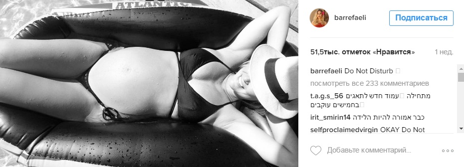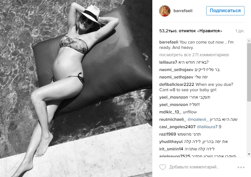 Сейчас она уже на девятом месяце и со дня на день должна родить. Но модель не перестает делиться фотографиями в купальнике с большим животом. Последний снимок Бар подписала: «Ты уже можешь выходить… Я готова. А еще я тежелая».