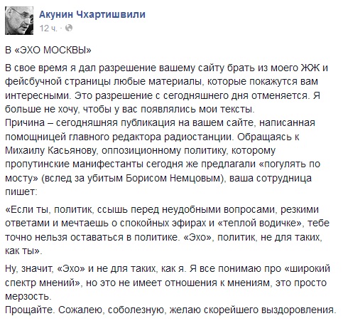 Коллеги Леси поинтересовались у Венедиктова, имеет ли право Рябцева говорить гостям, что «Эхо» не для них. Алексей Алексеевич в ответ напомнил: приглашать в эфир Касьянова и других оппозиционеров — личное дело авторов и продюсеров, а еще и назвал Касьянова «путинским бюрократом». Писатель Борис Акунин (60) поддержал Касьянова и запретил «Эху Москвы» публиковать на сайте любые материалы с его страниц на Facebook и в «Живом журнале».