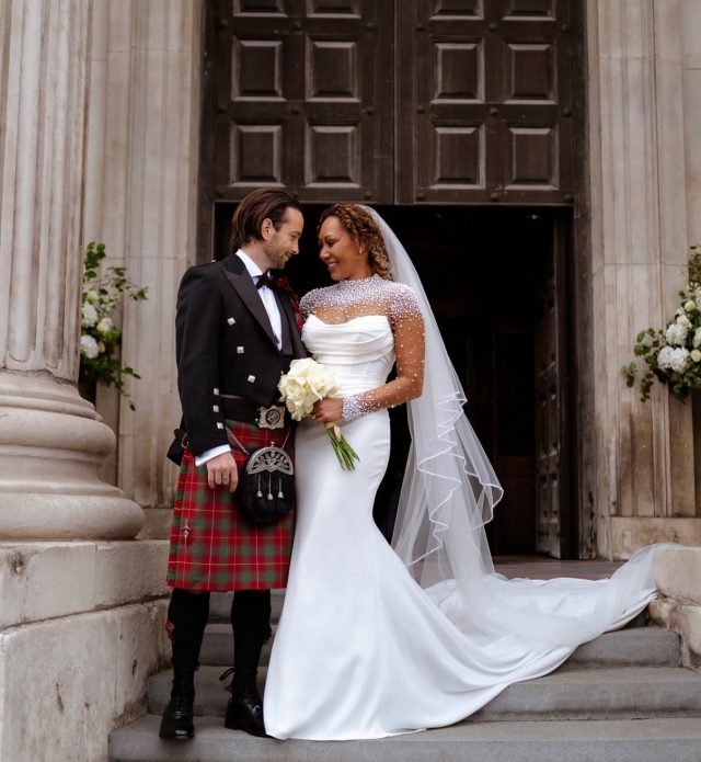 Невеста прошла к алтарю в классическом белом свадебном платье, а на женихе был традиционный шотландский килт. Среди приглашенных гостей на церемонии была Эмма Бантон, Кара Делевинь, Кэтрин Райан, Дейзи Лоу и другие знаменитости. Три дочери Мел стали ее подружками невесты.