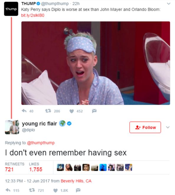 Дипло, видимо, не понравилось, что он оказался в самом конце списка, поэтому пару дней спустя в своем Twitter он заявил: «Я вообще не помню, чтобы у нас был секс».