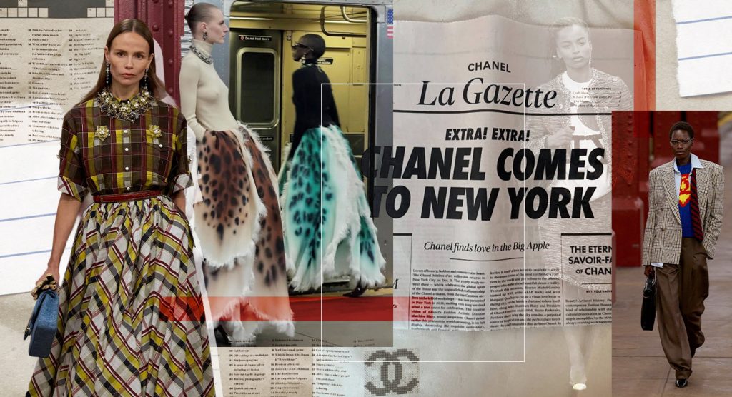 Для первого шоу Métiers d’Art под руководством Матье Блази гости получили по-настоящему нью-йоркские приглашения – в виде газет. Каждое из них содержало кроссворд и игру, в которой при соединении всех точек появлялась камелия – фирменный символ Chanel. На страницах также были намеки на место показа, а подвеска с вагонами поезда лишь подогревала слухи о том, что шоу пройдет прямо в метро.