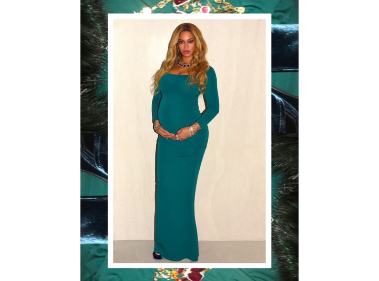 На Бейонсе было длинное обтягивающее платье цвета морской волны Nicole Miller.