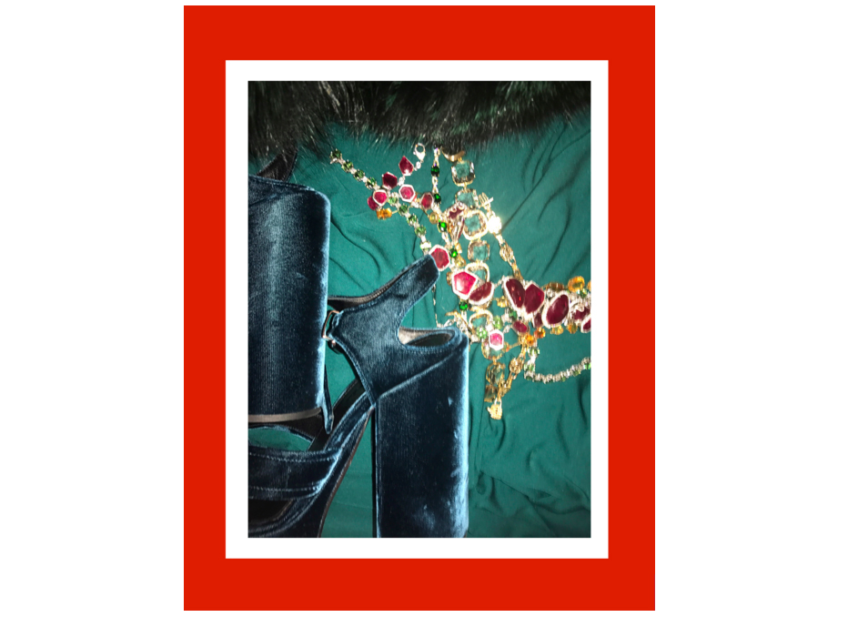 Платье певица дополнила бархатными босоножками Jil Sander и колье H. Stern and Coomi.