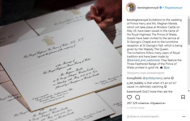 В начале марта принц Гарри (33) и Меган Маркл (36) разослали приглашения на свадьбу. Они заявили, что хотят разделить радостное событие со всеми, поэтому позвали не только родных и друзей, но и еще 2640 гостей (среди них жители графств Великобритании, люди из благотворительных организаций, сотрудники дворца и ученики местных школ).