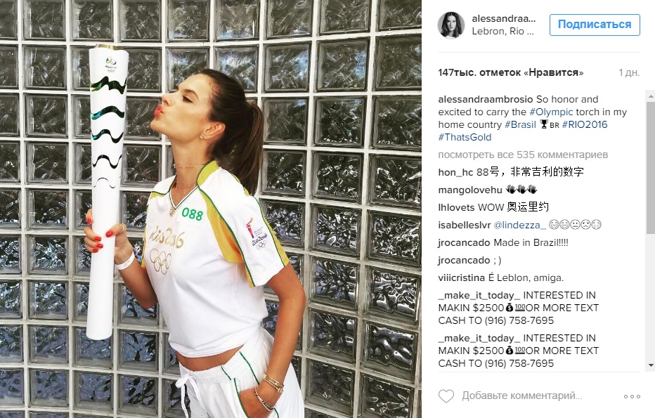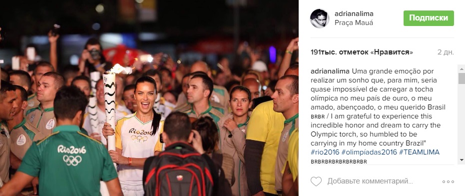 Если ты не знала, Адриана Лима (35) тоже родом из Бразилии, она, как и Амброссио, участвовала в эстафете Олимпийского огня: «Я в восторге, наконец, исполнилась моя мечта — я несу Олимпийский факел в своей родной Бразилии», — написала модель в своем Instagram.