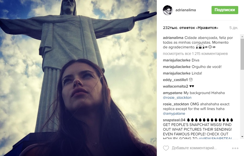 По приезду в Рио-де-Жанейро модель не упустила возможности сделать селфи на фоне самой главной достопримечательности города — статуи Христа.