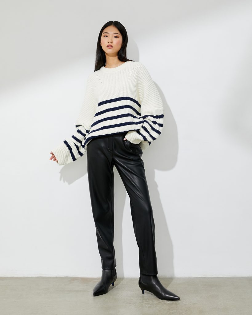 На что обратить внимание: мы влюбились в джемпер в полоску, ковбойские сапоги и брючный костюм с мужского плеча.
