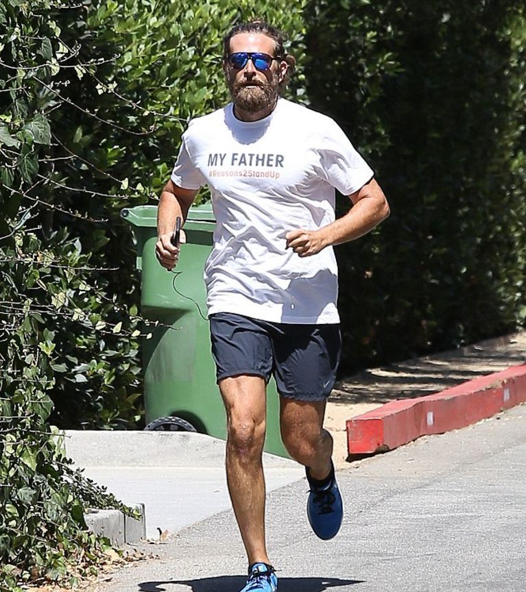 Вчера папарацци подловили неприлично бородатого Купера во время утренней пробежки. Волосы Брэдли были затянуты в тугой хвостик, а одет он был в белую майку с надписью «My father, #reasons2standup».