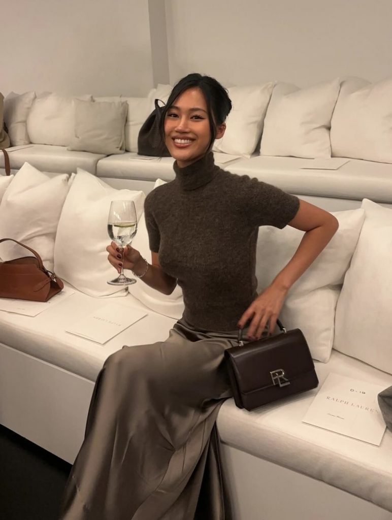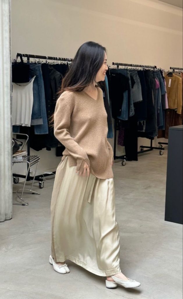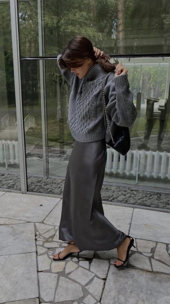 В TikTok фэшн-инфлюенсеры уже вовсю собирают такие образы, и их главные элементы – длинная юбка и свитер. Понимаем, на первый взгляд это может звучать скучно, бедно и не совсем chic. Именно поэтому в игру вступают материалы. Юбку выбирают исключительно из шелка, сатина, крепа или любой другой струящейся и визуально дорогой ткани, а свитер из кашемира или шерсти. В синергии эти материалы делают образ удобным, элегантным и по-настоящему новогодним. Если тебе кажется, что свитера и юбки недостаточно, предлагаем дополнить финальный лук аксессуарами – меховой горжеткой, манжетами или акцентными украшениями. И, конечно, не забывай об обуви: в таком образе предпочтение однозначно отдают шпилькам – и чем они ярче, тем лучше.